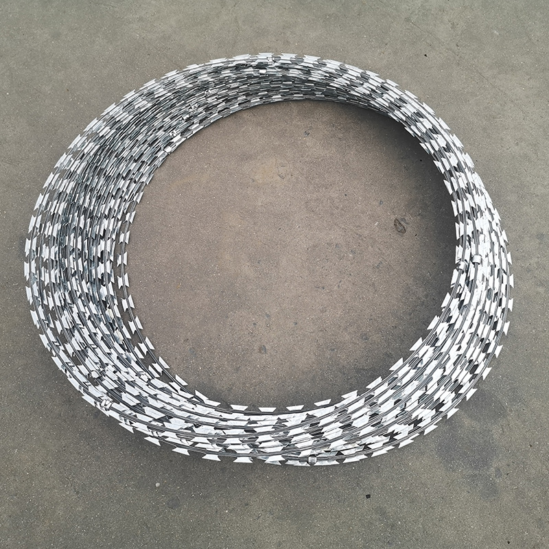 Plat wikkel skeermes spoele is 'n modifikasie van die spiraal skeermes sekuriteit versperring, aangepas vir gebruik in meer druk toestande. Plat sekuriteits versperring konsertina as spiraal sekuriteit versperring, ook gemaak van versterkte doringband konsertina. Plat skeermes versperring sekuriteit is anders as lemmetjiesdraad konsertina dat die spoele geleë in een vlak, wat maak die ontwerp baie meer kompak. En sy aangrenStuure spoele aanmekaar vasgemaak met krammetjies van gegalvaniseerde staal. Die verskaffing van 'n hoë beskermende eienskappe, plat veiligheidsskerm skeermes is meer kompak om te gebruik en minder aggressief, wat bydra tot sy wydverspreide gebruik of verskeie voorwerpe in stedelike omgewings.